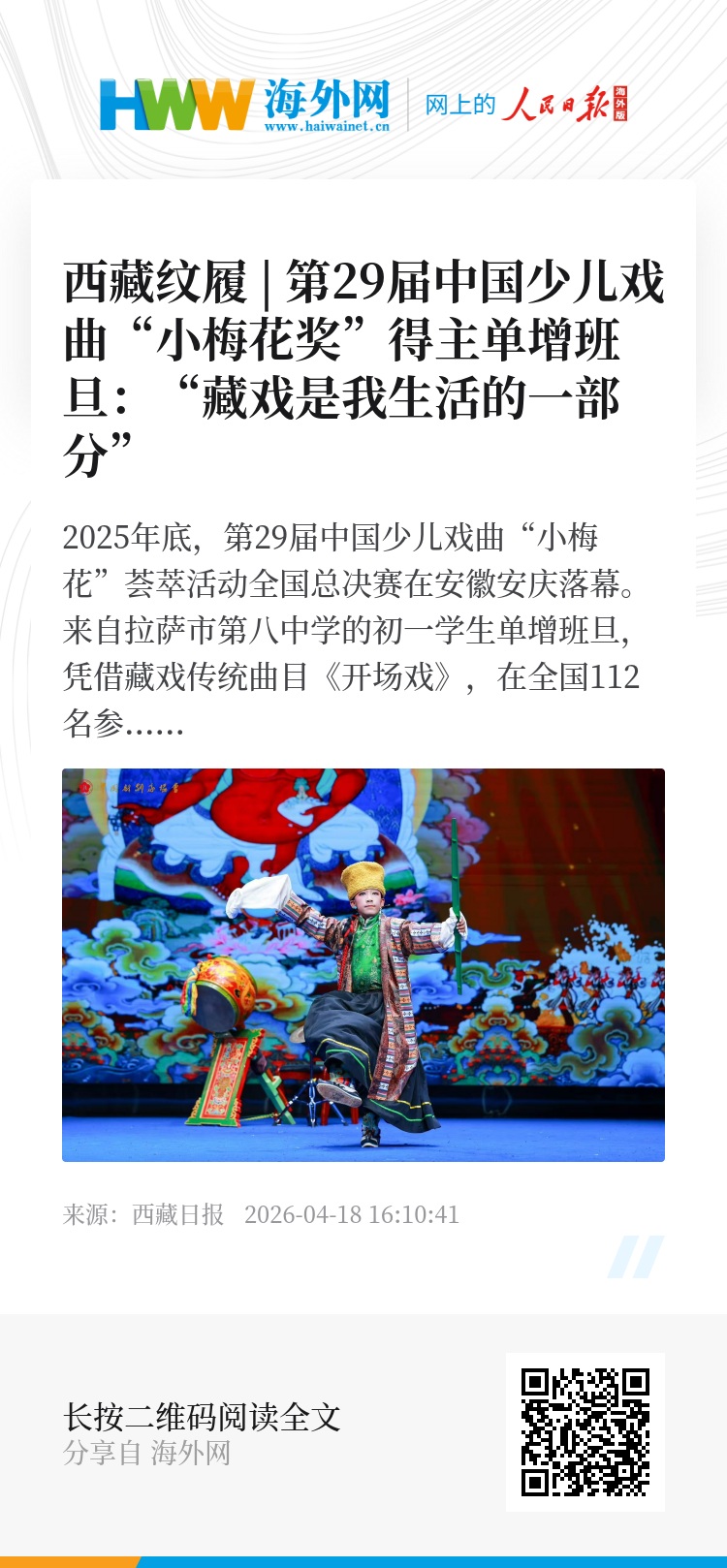 2025年底,第29届中国少儿戏曲“小梅花”荟萃活动全国总决赛在安徽安庆落幕。来自拉萨市第八中学的初一学生单增班旦,凭借藏戏传统曲目《开场戏》,在全国112名参赛小选手中脱颖而出,荣获“小梅花”称号。与他一同获奖的,还有来自西藏的罗珍同学。