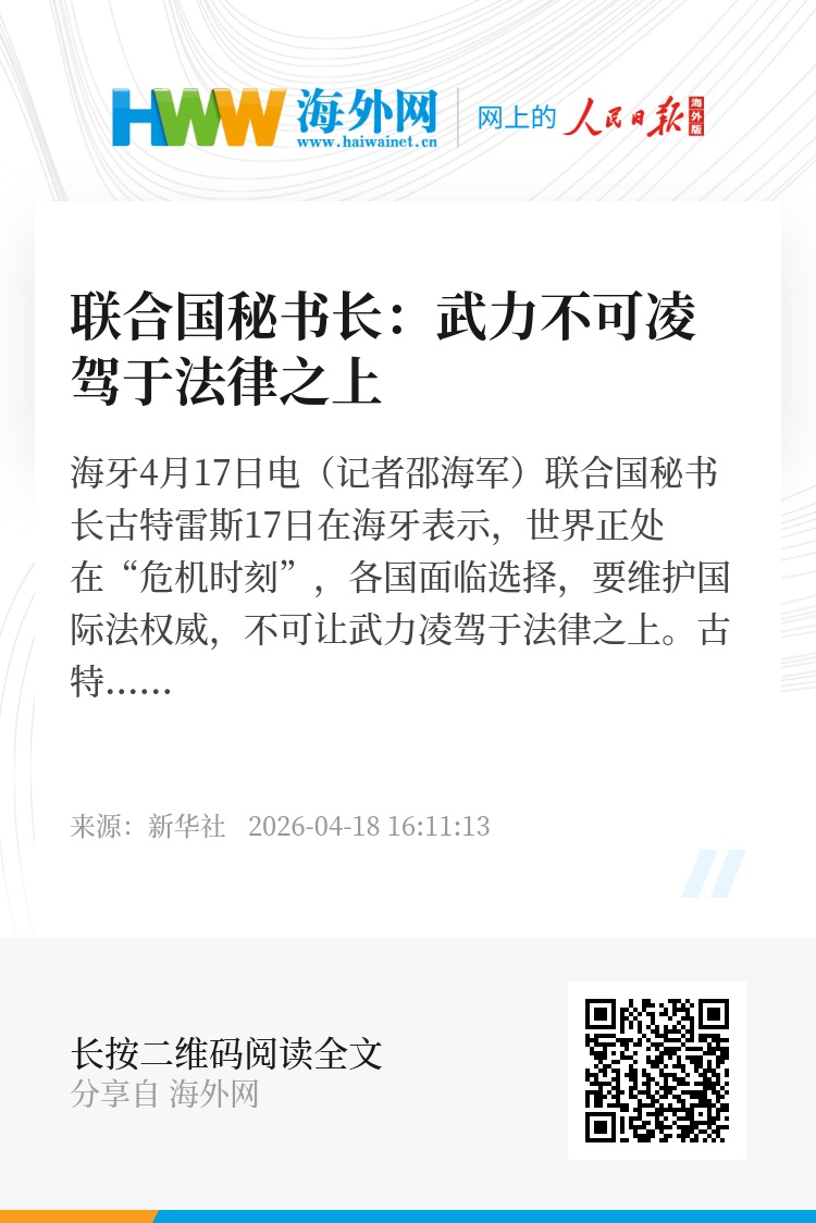 新华社海牙4月17日电(记者邵海军)联合国秘书长古特雷斯17日在海牙表示,世界正处在“危机时刻”,各国面临选择,要维护国际法权威,不可让武力凌驾于法律之上。