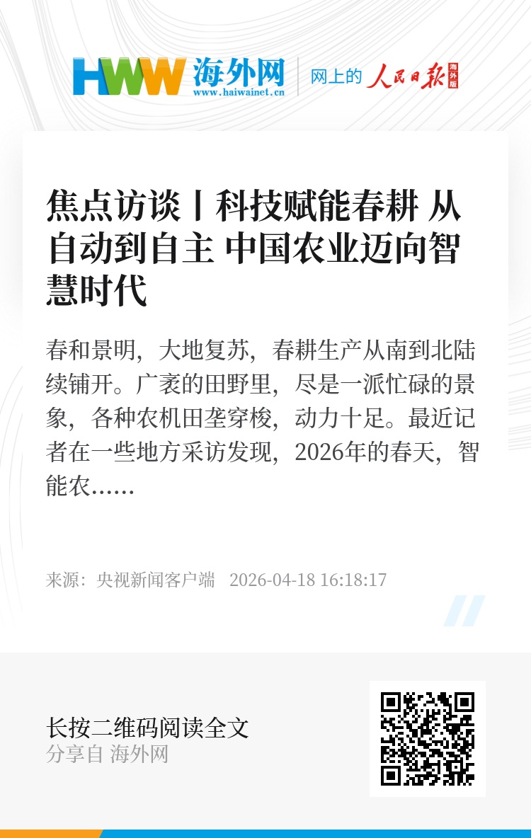 如今的智能农机,不只是下地干活的田间工具,也是助力科学种植的智慧帮手。随着物联网、大数据、人工智能等技术与农业的深度融合,智能农机正从自动化作业向自主化作业升级,也就是让农机会看、会算、会自己干。可以看出,从依赖进口到自主创新,中国农机的现代化脚步越走越稳。智能农机不仅为春耕生产提质增效,为传统农业注入强劲动能,更有力推动中国农业加快迈向数字化、智能化,为粮食安全和乡村振兴提供坚实支撑。