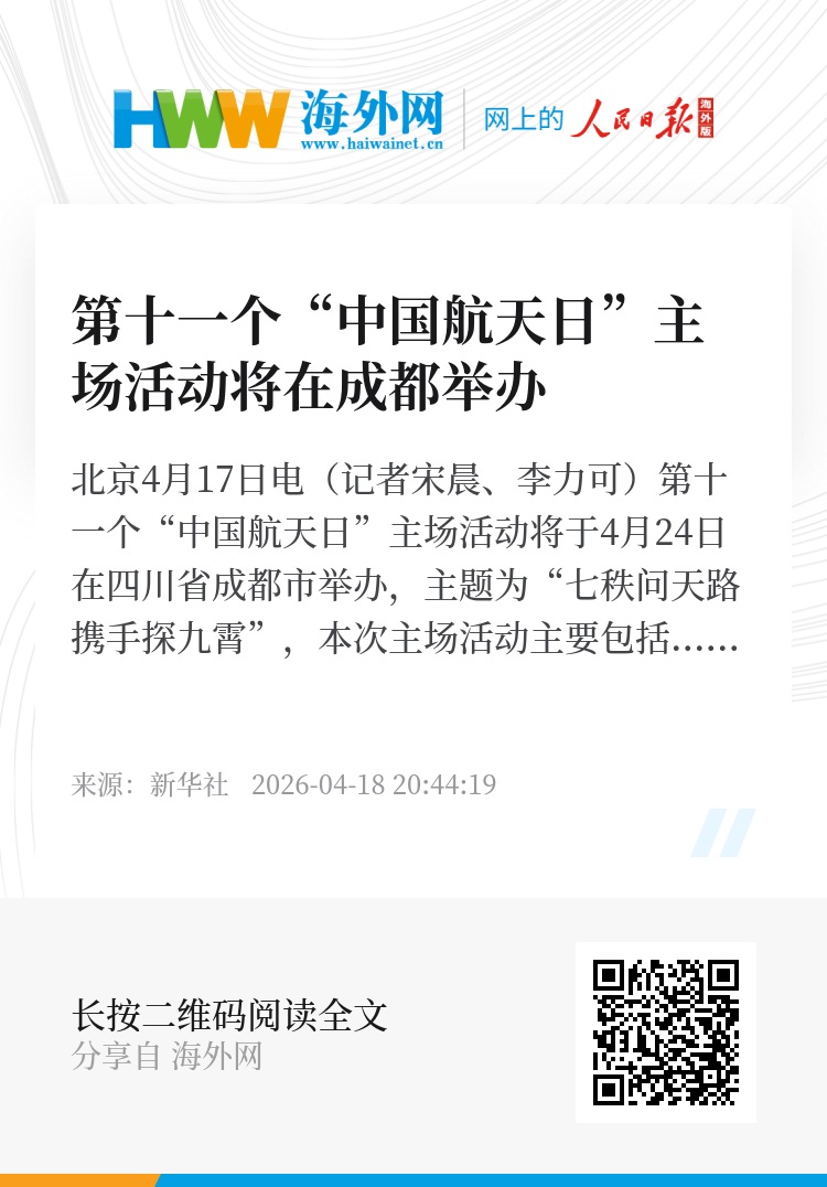 新华社北京4月17日电(记者宋晨、李力可)第十一个“中国航天日”主场活动将于4月24日在四川省成都市举办,主题为“七秩问天路 携手探九霄”,本次主场活动主要包括启动仪式、航天科普系列展览、航天文化艺术论坛等。