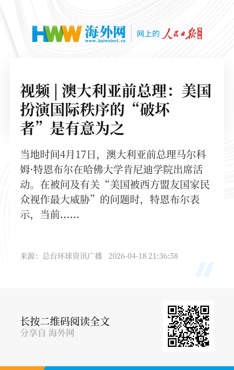 在被问及有关“美国被西方盟友国家民众视作最大威胁”的问题时,特恩布尔表示,当前美国被国际社会普遍视作秩序的“破坏者”而非“维护者”,在西方国家的民意调查中获得负面评价“不可避免”。