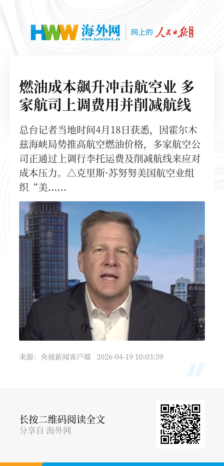 总台记者当地时间4月18日获悉,因霍尔木兹海峡局势推高航空燃油价格,多家航空公司正通过上调行李托运费及削减航线来应对成本压力。