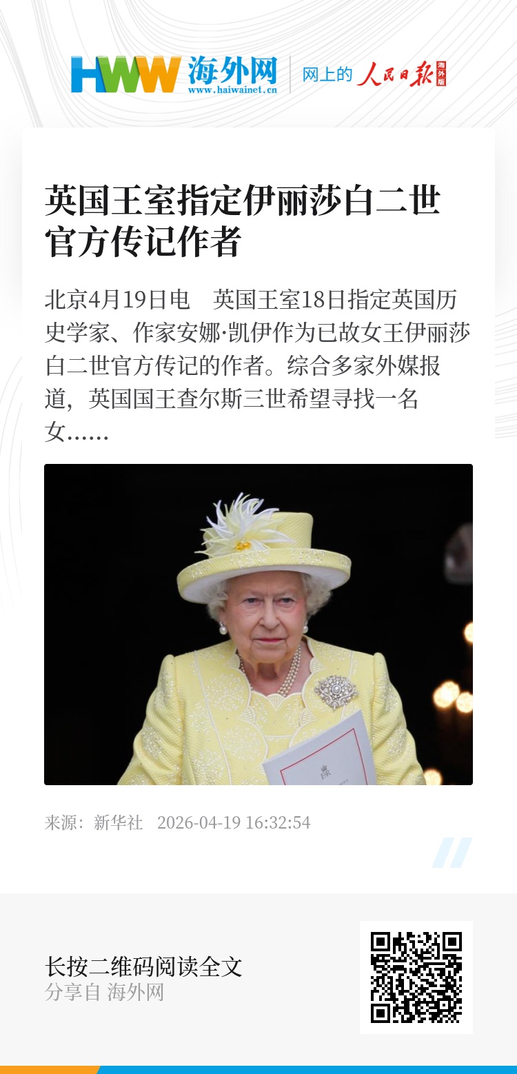 新华社北京4月19日电 英国王室18日指定英国历史学家、作家安娜·凯伊作为已故女王伊丽莎白二世官方传记的作者。