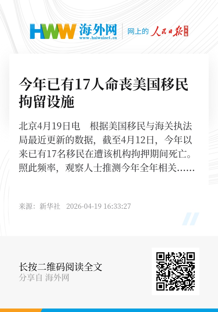 新华社北京4月19日电 根据美国移民与海关执法局最近更新的数据,截至4月12日,今年以来已有17名移民在遭该机构拘押期间死亡。照此频率,观察人士推测今年全年相关死亡人数可能会超过去年。