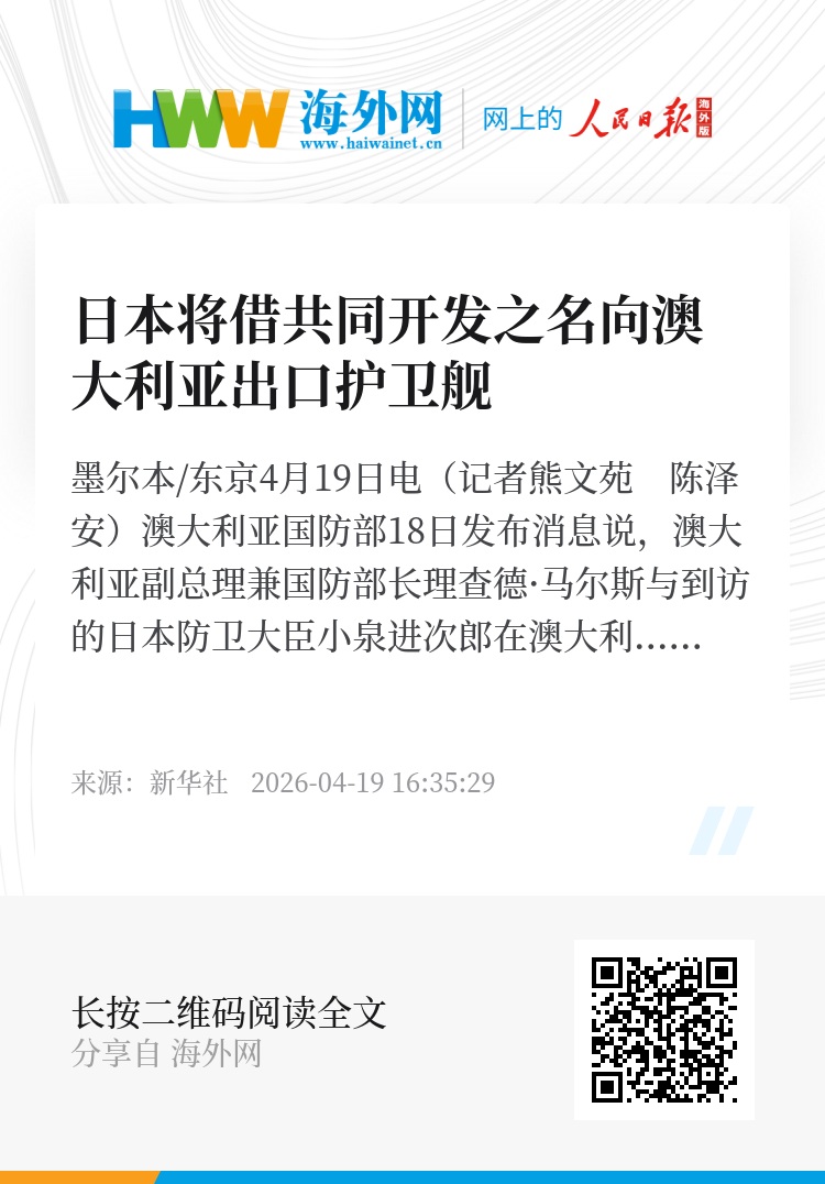 新华社墨尔本/东京4月19日电(记者熊文苑 陈泽安)澳大利亚国防部18日发布消息说,澳大利亚副总理兼国防部长理查德·马尔斯与到访的日本防卫大臣小泉进次郎在澳大利亚墨尔本签署备忘录,将基于日本升级版“最上”级护卫舰共同开发澳海军新型舰艇。日本共同社说,此举实质上意味着日本将向澳大利亚出口护卫舰。