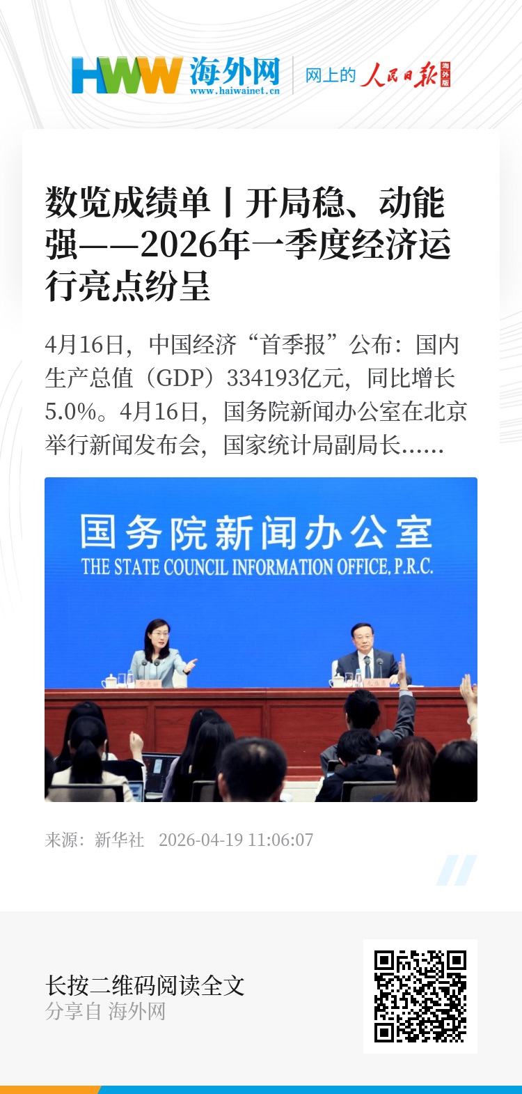 2026年是“十五五”开局之年,中国经济交出一份成色十足的首季成绩单,发展韧性和活力进一步彰显。