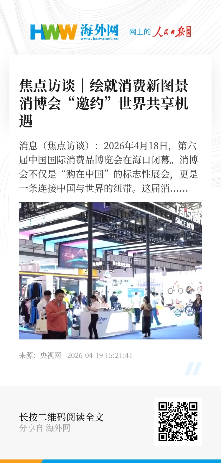 央视网消息(焦点访谈):2026年4月18日,第六届中国国际消费品博览会在海口闭幕。消博会不仅是“购在中国”的标志性展会,更是一条连接中国与世界的纽带。这届消博会既是“十五五”开局之年我国重大外贸展会的首展,也是海南自贸港自去年12月全岛封关运作以来的首秀。老朋友如约而至,新朋友慕名而来。封关后的首届消博会有哪些新气象,中国的“磁吸力”又在展会上得到怎样的释放呢?