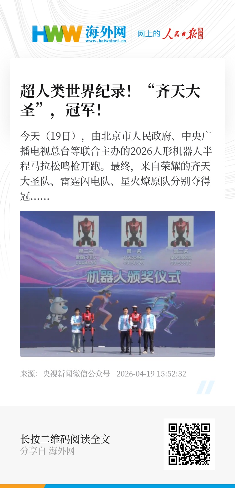 今天(19日),由北京市人民政府、中央广播电视总台等联合主办的2026人形机器人半程马拉松鸣枪开跑。