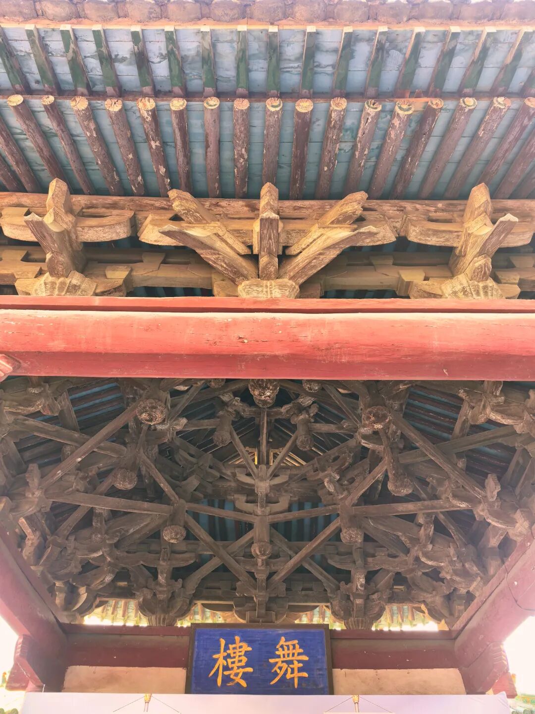 舞楼最独特的是戏台顶部的八卦藻井,没有一根大梁椽木,天井勾栏交榫不用一铆一钉,其细木交连,层层向上,构成穹顶。屋顶鸱吻为元代构件,琉璃瓦品为孔雀蓝色,十分珍贵。