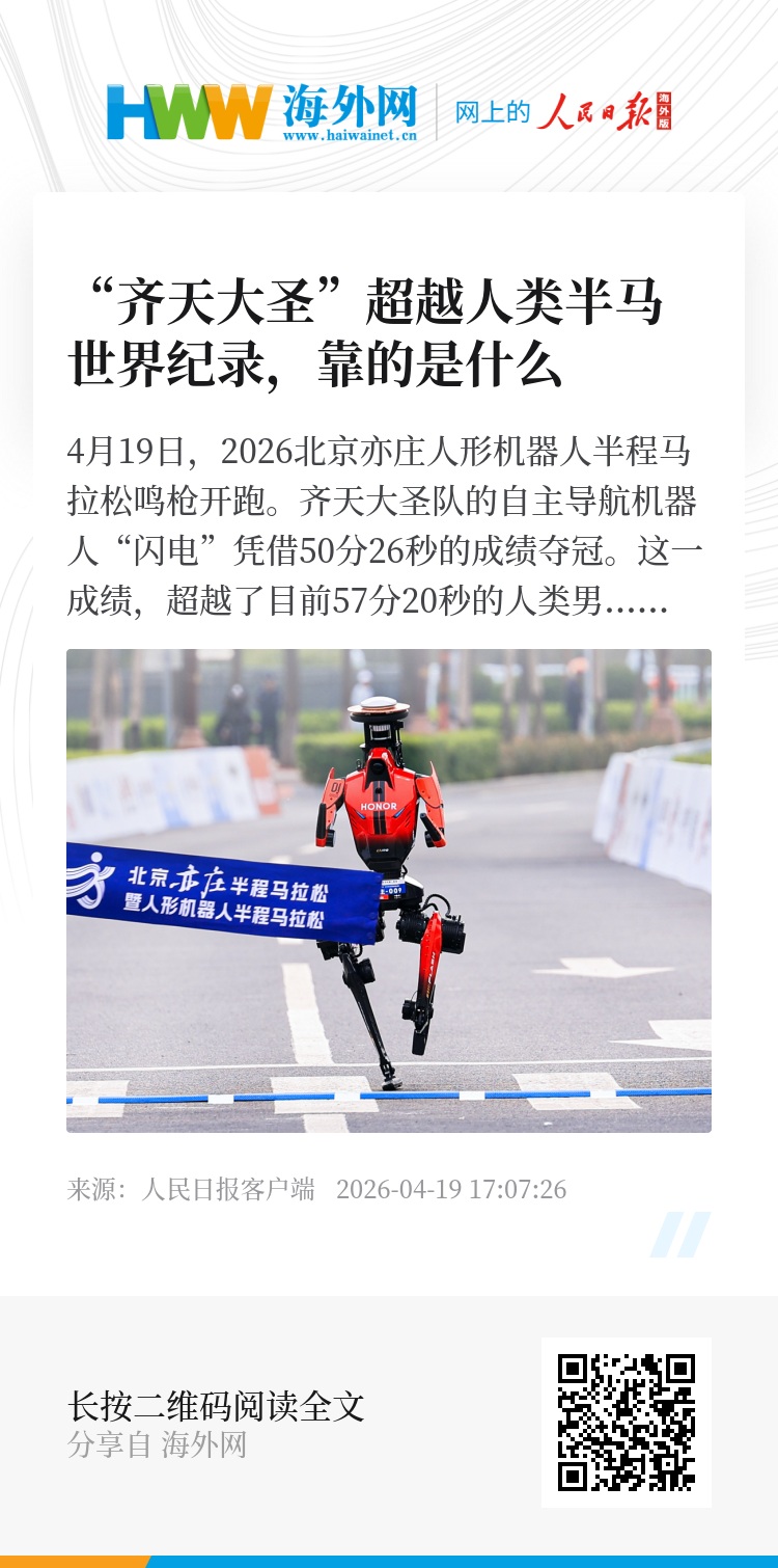 4月19日,2026北京亦庄人形机器人半程马拉松鸣枪开跑。齐天大圣队的自主导航机器人“闪电”凭借50分26秒的成绩夺冠。这一成绩,超越了目前57分20秒的人类男子半马世界纪录。