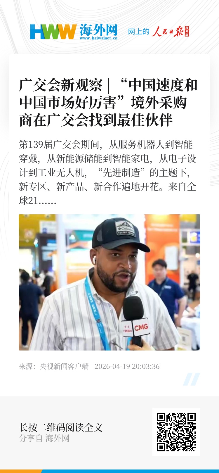 广交会展馆里,一张张笑脸、一份份协议,串联起全球产业合作的新图景。从提供产品到提供解决方案,从采购到联合生产,中外企业建立起彼此信赖、深度绑定的伙伴关系。在139届广交会第一期的会场内外,高质量发展的中国正以开放包容的姿态,为每个渴望进步的合作伙伴送去希望与机遇。广交会如一座桥梁,连接着中国与世界、当下与未来。创新的火花在这里点燃,信任的种子在这里播撒,而一个绿色、智能、共赢的未来,也正在每一项合作中生根发芽。