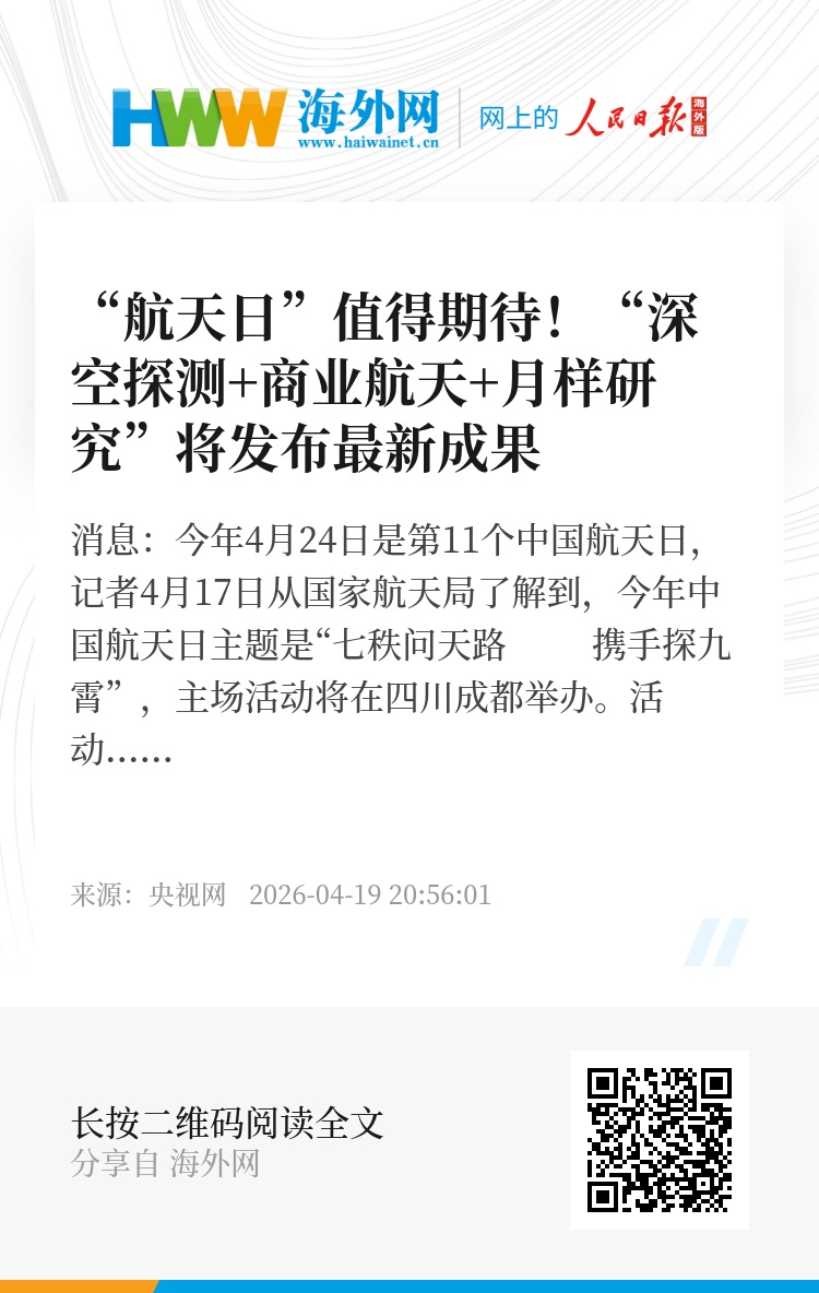 2026年中国航天日宣传预告片、活动安排正式发布。中国航天日主场活动包括启动仪式、航天科普系列展览、航天文化艺术论坛等,同期还将举办中国航天大会、航天科普进校园、技术交流等活动。启动仪式于4月24日上午举办,将发布主题宣传片、主题曲,发布航天领域重大信息等。国家航天局系统工程司副司长刘云峰介绍,在主场的航天科普展览上,嫦娥五号、嫦娥六号分别采集的月球正面、月球背面样品将同框展出,《星辰足迹——月背之约》航天大空间VR科普科幻剧也将邀请公众参与。启动仪式上还将发布深空探测、商业航天以及嫦娥五号月球样品研究的最新成果等一系列重大信息。