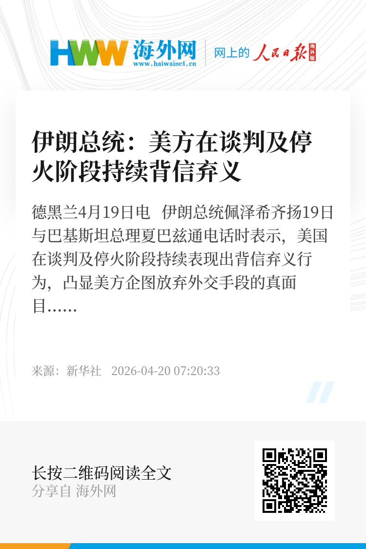 新华社德黑兰4月19日电 伊朗总统佩泽希齐扬19日与巴基斯坦总理夏巴兹通电话时表示,美国在谈判及停火阶段持续表现出背信弃义行为,凸显美方企图放弃外交手段的真面目。