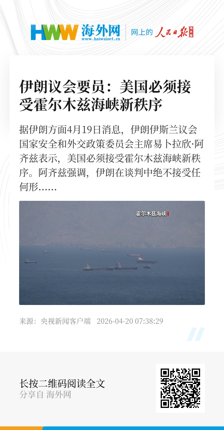 据伊朗方面4月19日消息,伊朗伊斯兰议会国家安全和外交政策委员会主席易卜拉欣·阿齐兹表示,美国必须接受霍尔木兹海峡新秩序。