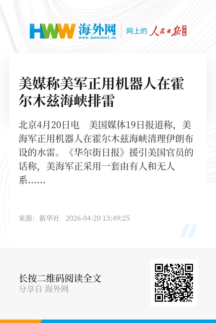 新华社北京4月20日电 美国媒体19日报道称,美海军正用机器人在霍尔木兹海峡清理伊朗布设的水雷。