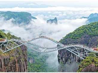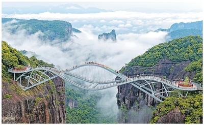 近日,浙江省台州市仙居县神仙居景区云雾缭绕,群峦若隐若现,宛如人间仙境,吸引众多游客前来赏景、游玩。图为游客在神仙居景区如意桥上游玩。