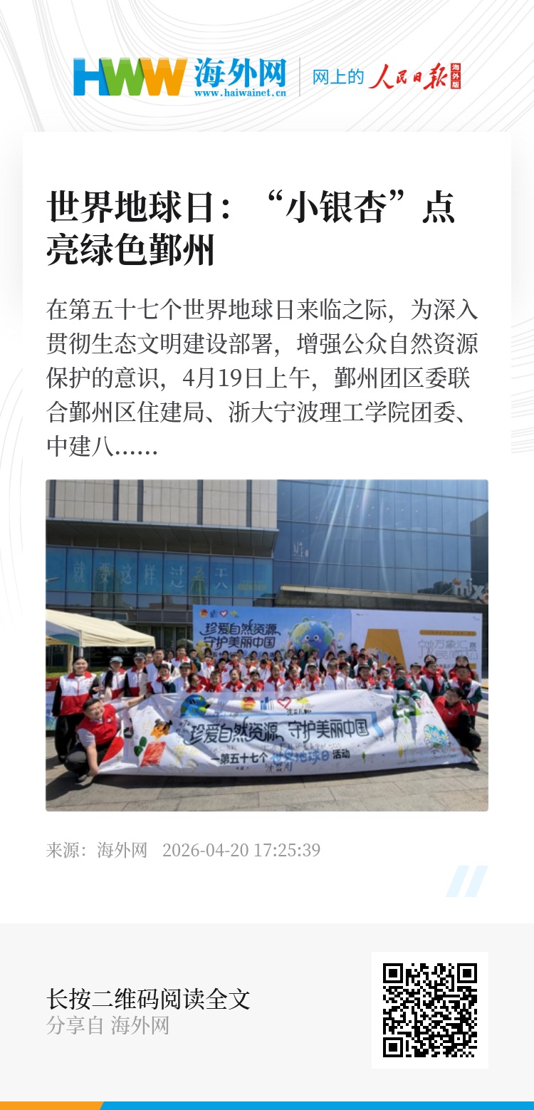 在第五十七个世界地球日来临之际,为深入贯彻生态文明建设部署,增强公众自然资源保护的意识,4月19日上午,鄞州团区委联合鄞州区住建局、浙大宁波理工学院团委、中建八局浙江公司团委在宁波万象汇联合举办“珍爱自然资源,守护美丽中国”主题活动。本次活动创新打造大中小一体化志愿服务模式,联动高校大学生、中校学生和鄞州区“小银杏”青年志愿者,以青春合力守护地球家园,传播绿色低碳理念,朝气蓬勃的身影成为商圈里一道亮丽的风景线。