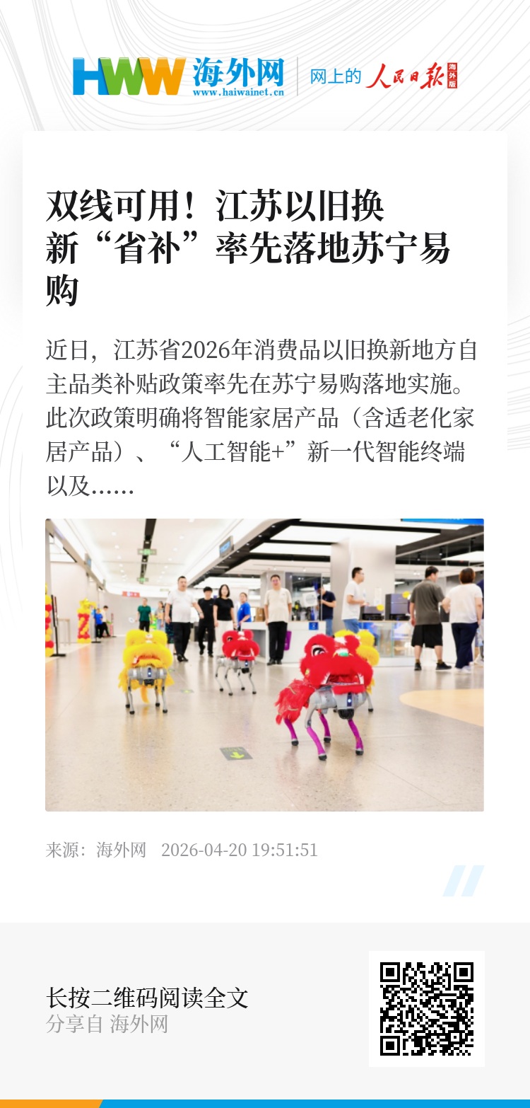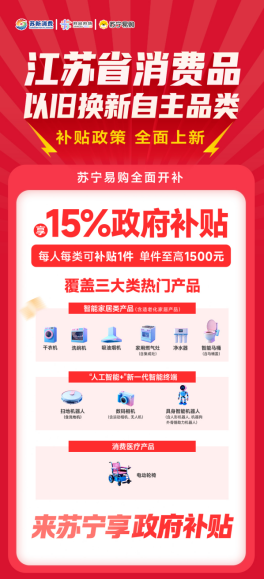 近日,江苏省2026年消费品以旧换新地方自主品类补贴政策率先在苏宁易购落地实施。此次政策明确将智能家居产品(含适老化家居产品)、“人工智能+”新一代智能终端以及消费医疗产品纳入补贴范围,每人最高可享受1.5万元补贴。