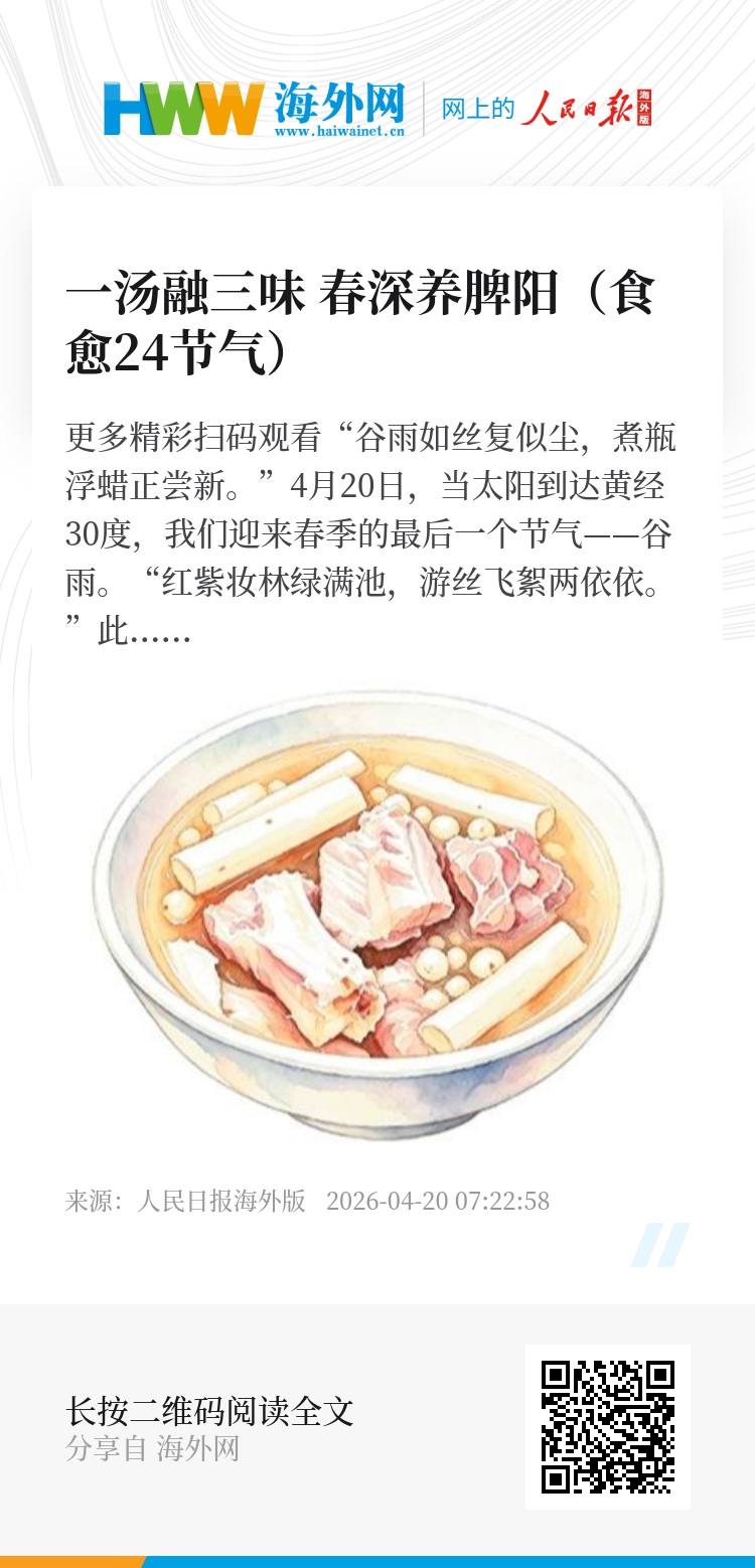 谷雨时节,少不了合时令的美味。“谷雨时节,推荐一道应季食养佳品——山药芡实排骨汤。”张怡介绍,这道汤取材寻常,但配伍精当,做法简便,老少咸宜,以温和绵长之力滋养身体,恰如谷雨时节的绵绵春雨,润物无声。