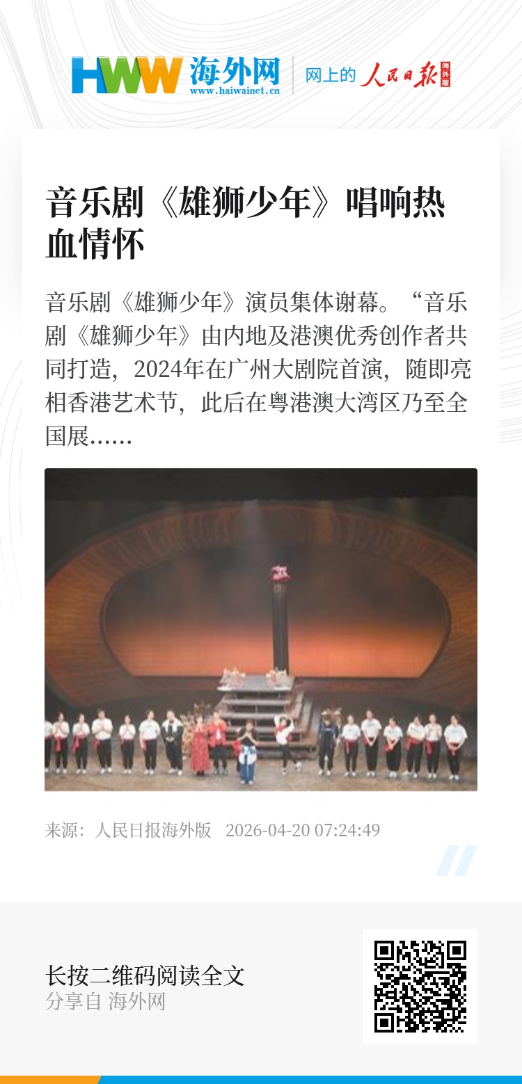 “音乐剧《雄狮少年》由内地及港澳优秀创作者共同打造,2024年在广州大剧院首演,随即亮相香港艺术节,此后在粤港澳大湾区乃至全国展开巡演。这次是第三轮巡演,在广州、廊坊、上海、泉州4站,均收获观众热烈反响。”音乐剧《雄狮少年》制作人、广州大剧院副总经理陈睿对记者说。