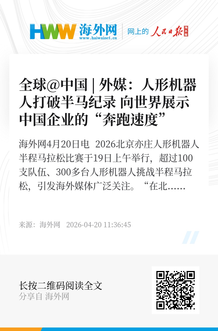 海外网4月20日电 2026北京亦庄人形机器人半程马拉松比赛于19日上午举行,超过100支队伍、300多台人形机器人挑战半程马拉松,引发海外媒体广泛关注。