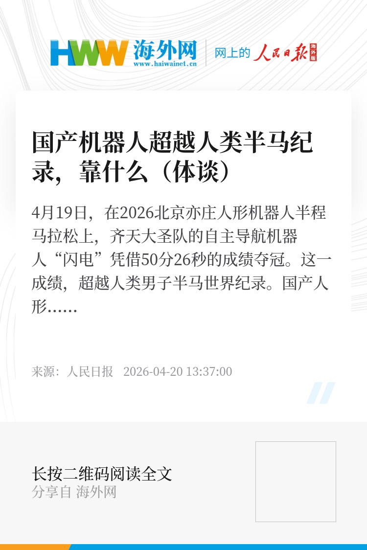 4月19日,在2026北京亦庄人形机器人半程马拉松上,齐天大圣队的自主导航机器人“闪电”凭借50分26秒的成绩夺冠。这一成绩,超越人类男子半马世界纪录。