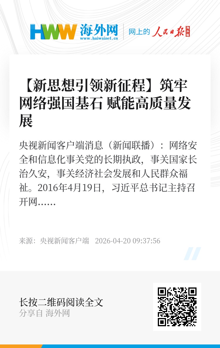 央视新闻客户端消息(新闻联播):网络安全和信息化事关党的长期执政,事关国家长治久安,事关经济社会发展和人民群众福祉。2016年4月19日,习近平总书记主持召开网络安全和信息化工作座谈会并发表重要讲话,强调推进网络强国建设,推动我国网信事业发展,让互联网更好造福国家和人民。十年来,以习近平同志为核心的党中央引领和把握信息革命发展潮流,全面布局、统筹推进网络安全和信息化工作,推动我国从网络大国向着网络强国阔步迈进。