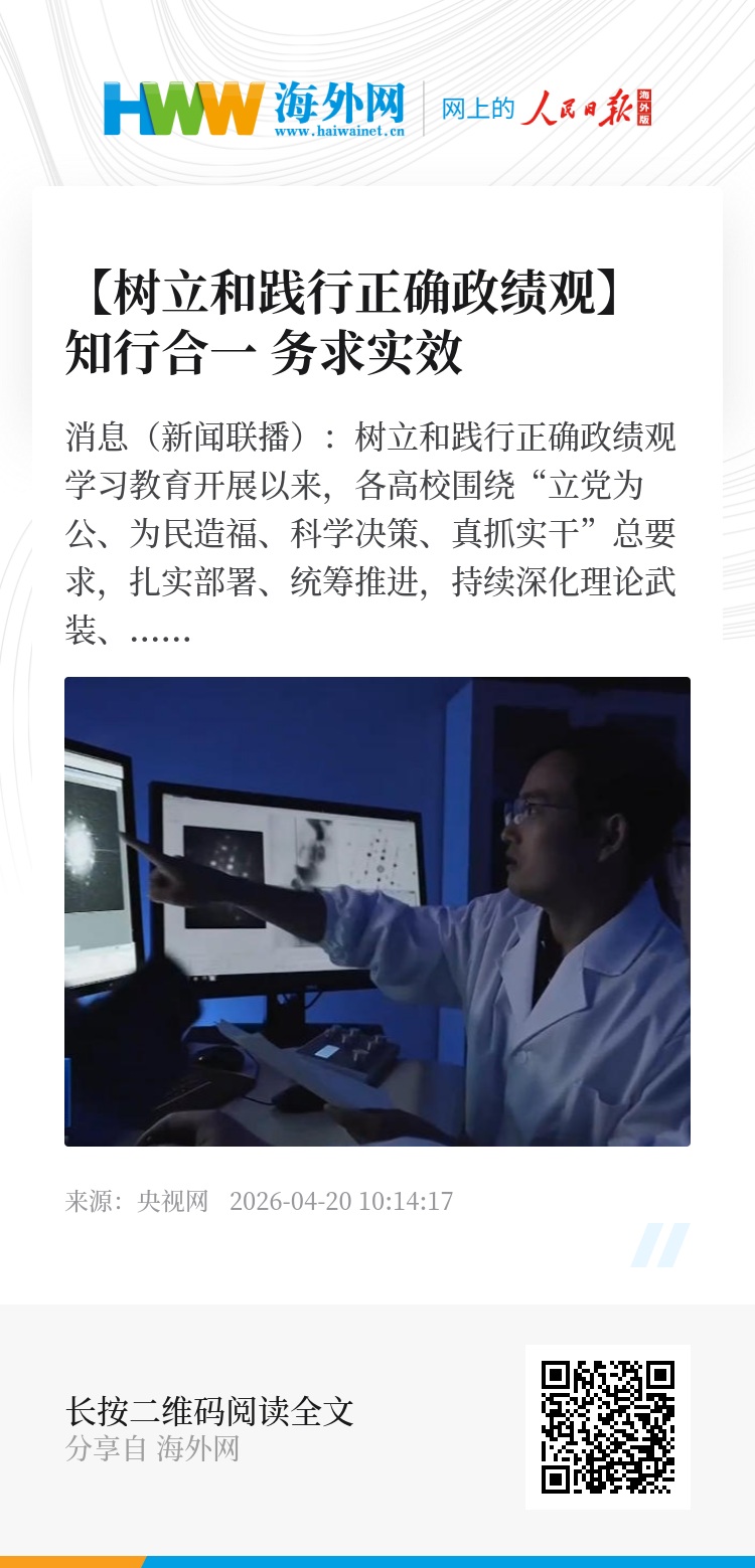 央视网消息(新闻联播):树立和践行正确政绩观学习教育开展以来,各高校围绕“立党为公、为民造福、科学决策、真抓实干”总要求,扎实部署、统筹推进,持续深化理论武装、坚持学用结合,推动学习教育不断走深走实。
