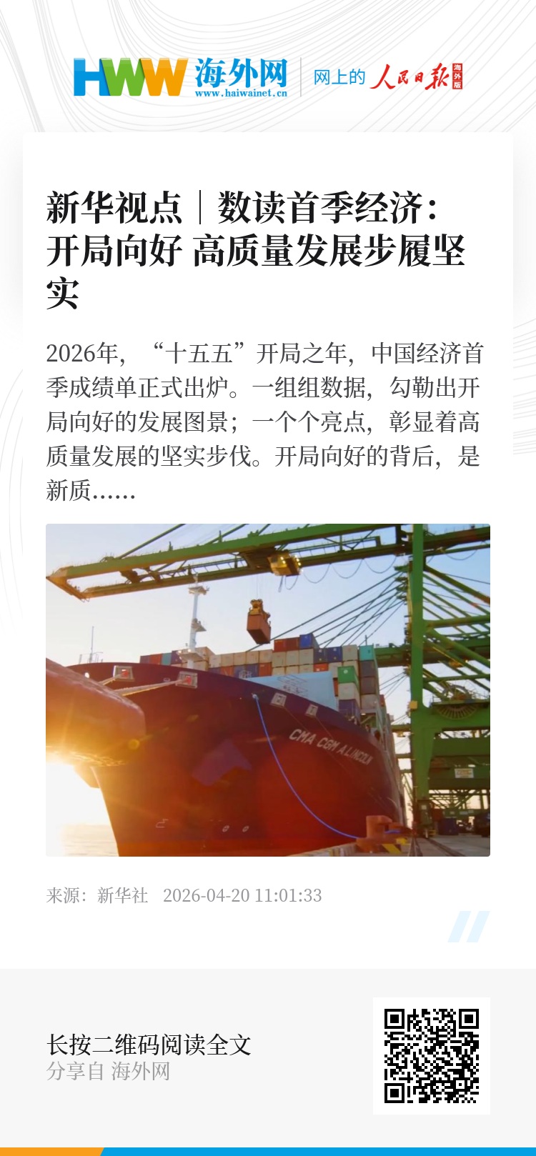 2026年,“十五五”开局之年,中国经济首季成绩单正式出炉。一组组数据,勾勒出开局向好的发展图景;一个个亮点,彰显着高质量发展的坚实步伐。