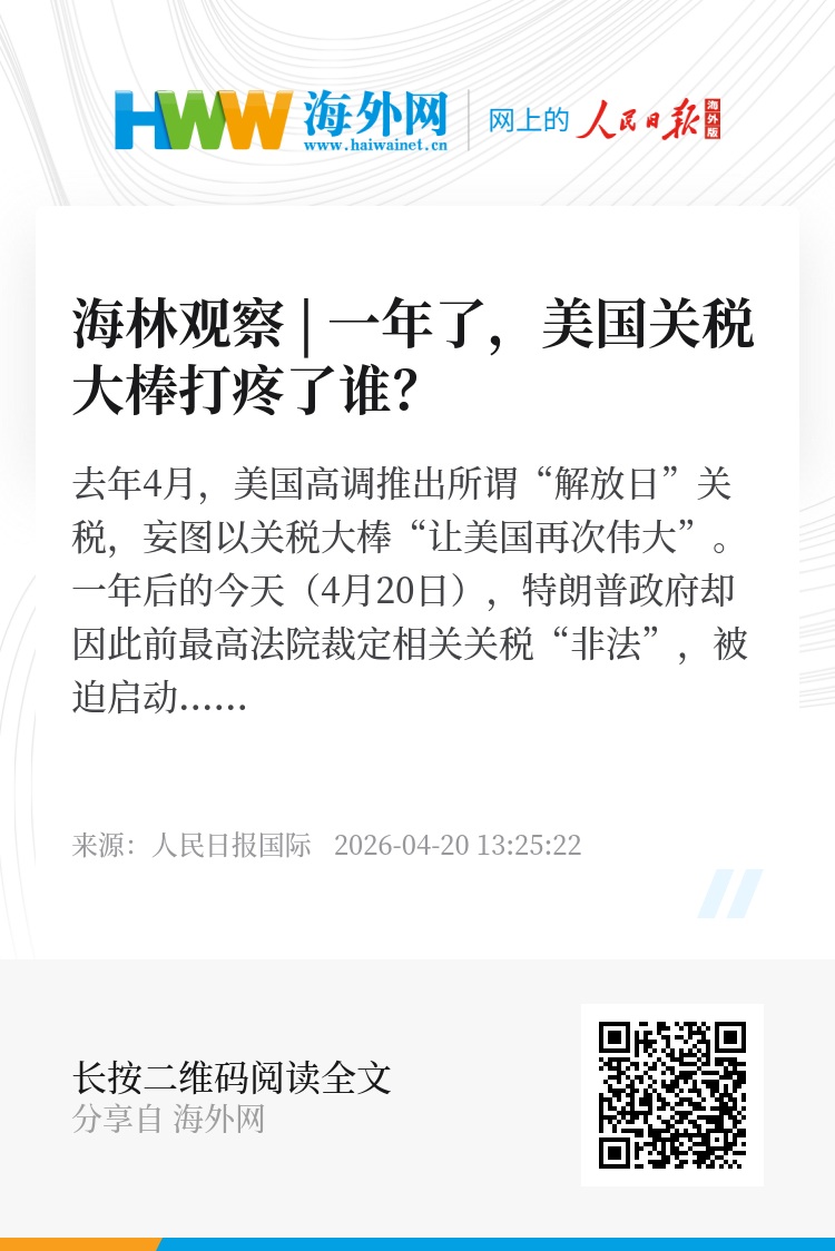 去年4月,美国高调推出所谓“解放日”关税,妄图以关税大棒“让美国再次伟大”。一年后的今天(4月20日),特朗普政府却因此前最高法院裁定相关关税“非法”,被迫启动涉及1660亿美元的史上最大规模关税退款程序。这场轰轰烈烈的关税大战,真的让美国得偿所愿了吗?事实是:贸易逆差不降反增,制造业回流成空谈,美国消费者和企业为千亿额外成本买单。本期海林观察,带你看清这场关税闹剧的真相。(王海林)