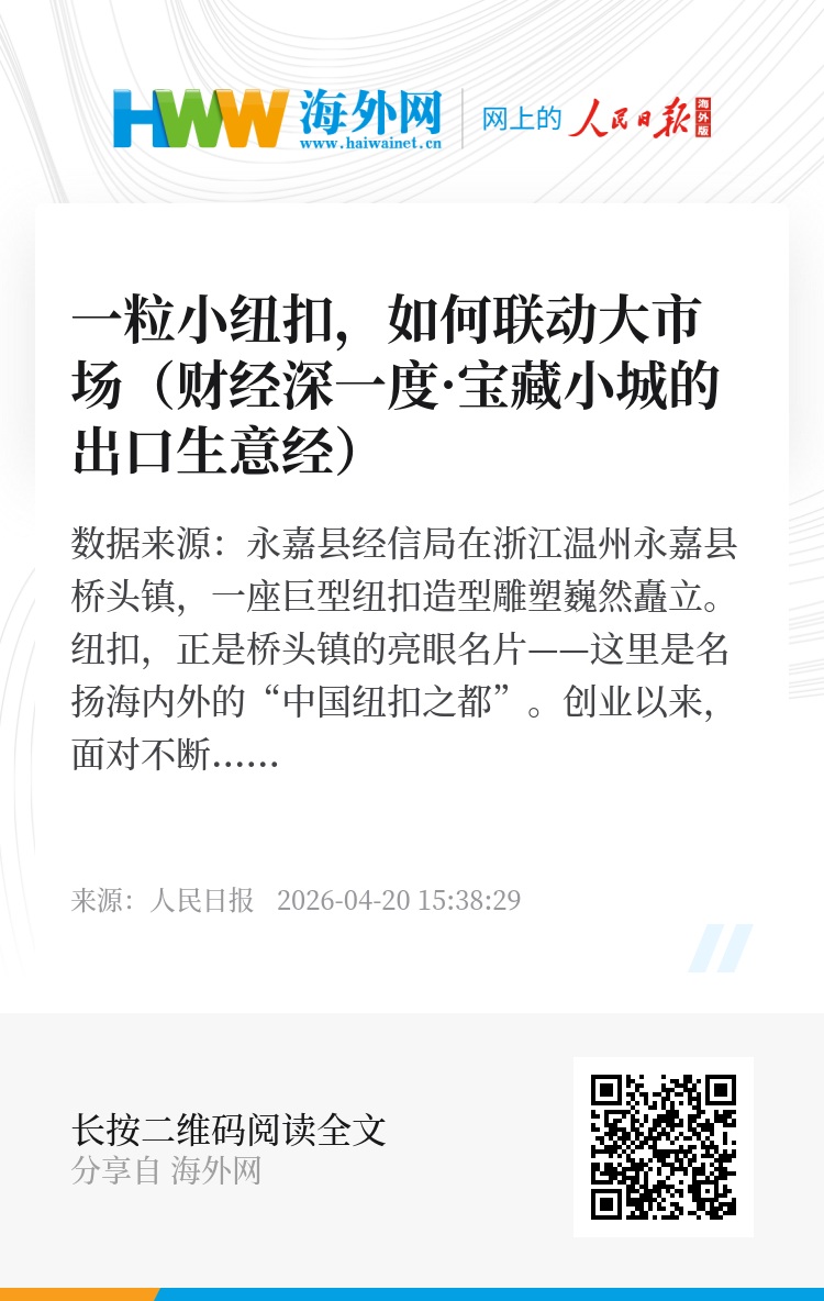 在浙江温州永嘉县桥头镇,一座巨型纽扣造型雕塑巍然矗立。纽扣,正是桥头镇的亮眼名片——这里是名扬海内外的“中国纽扣之都”。
