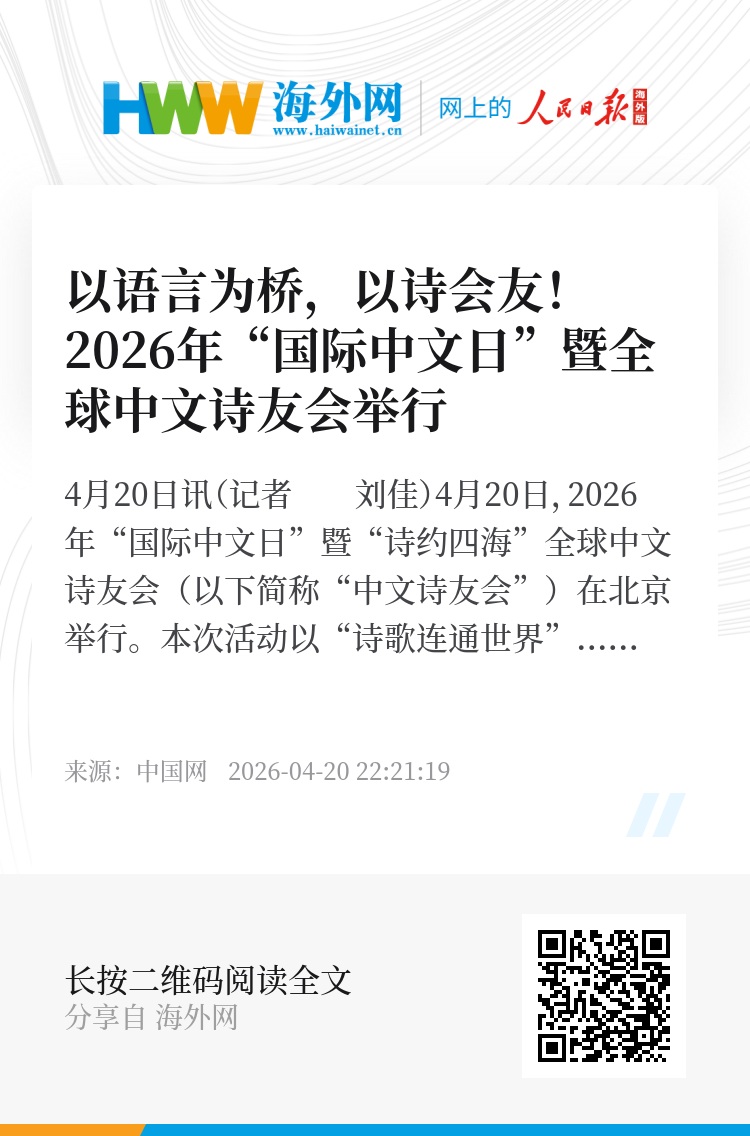 中国网4月20日讯(记者 刘佳)4月20日,2026年“国际中文日”暨“诗约四海”全球中文诗友会(以下简称“中文诗友会”)在北京举行。本次活动以“诗歌连通世界”为主题,丰富多彩的诗词文化体验,吸引众多中外语言爱好者、文化学者及外交使节参与,见证文明交流互鉴的生动实践。