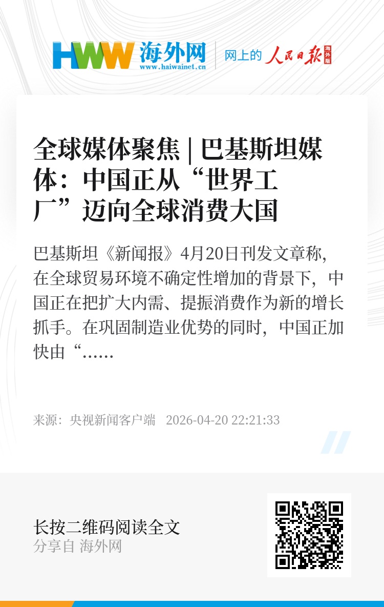 巴基斯坦《新闻报》4月20日刊发文章称,在全球贸易环境不确定性增加的背景下,中国正在把扩大内需、提振消费作为新的增长抓手。在巩固制造业优势的同时,中国正加快由“生产大国”向“消费大国”转型,这不仅将为自身经济注入新动能,也将为全球市场带来更大机遇。