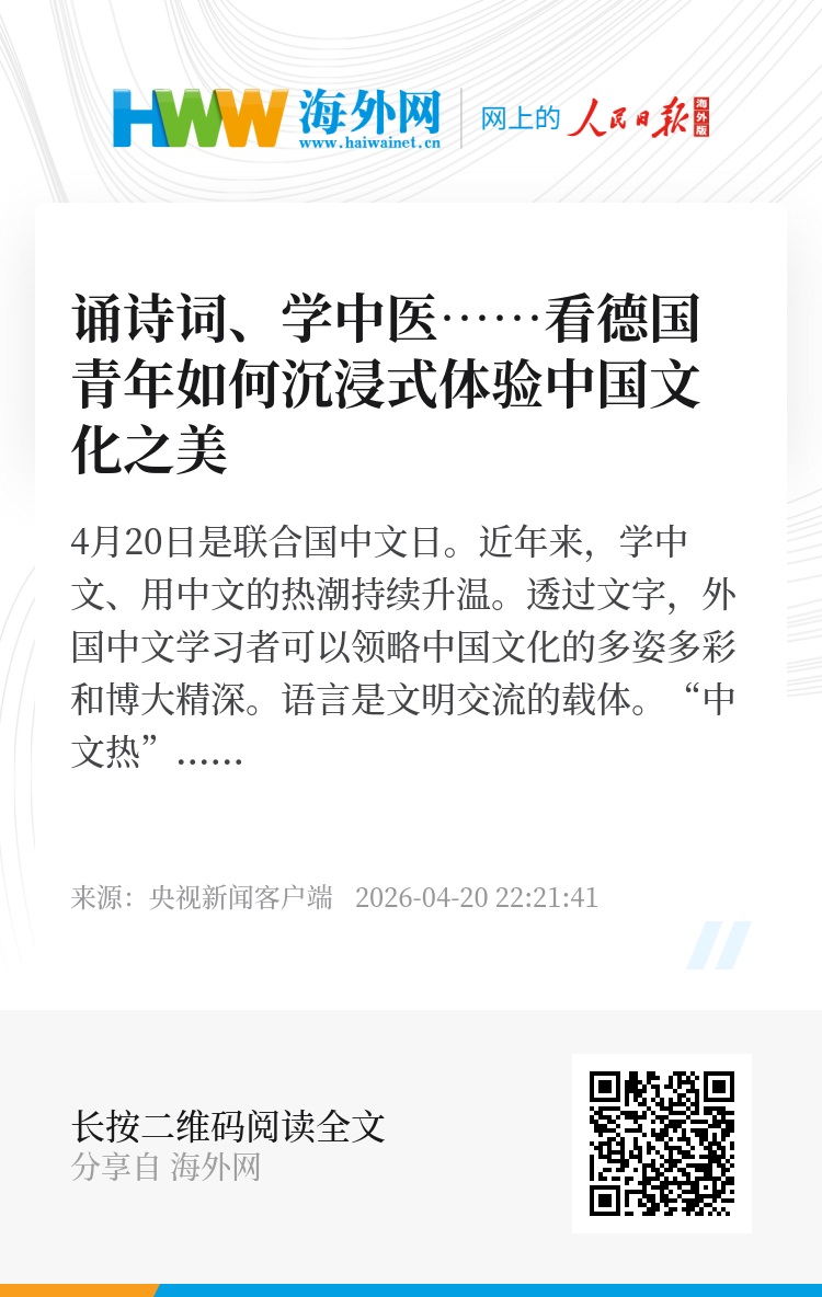 4月20日是联合国中文日。近年来,学中文、用中文的热潮持续升温。透过文字,外国中文学习者可以领略中国文化的多姿多彩和博大精深。语言是文明交流的载体。“中文热”是中国与世界双向奔赴的生动注脚,更是开放中国与全球共享机遇的时代印记。