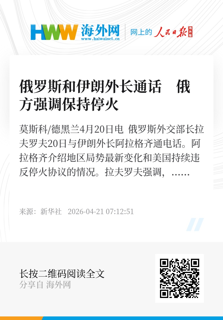 新华社莫斯科/德黑兰4月20日电 俄罗斯外交部长拉夫罗夫20日与伊朗外长阿拉格齐通电话。阿拉格齐介绍地区局势最新变化和美国持续违反停火协议的情况。拉夫罗夫强调,必须在各方先前赞同的条件下保持停火。