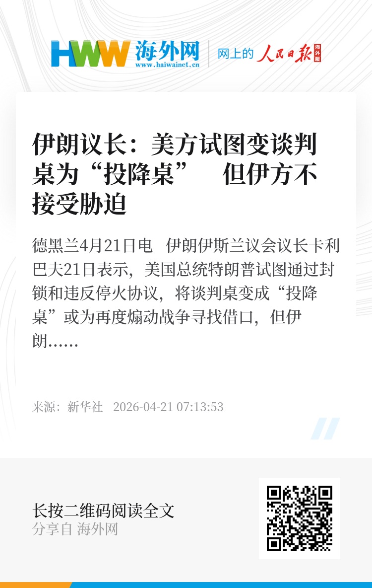 新华社德黑兰4月21日电 伊朗伊斯兰议会议长卡利巴夫21日表示,美国总统特朗普试图通过封锁和违反停火协议,将谈判桌变成“投降桌”或为再度煽动战争寻找借口,但伊朗不接受胁迫。