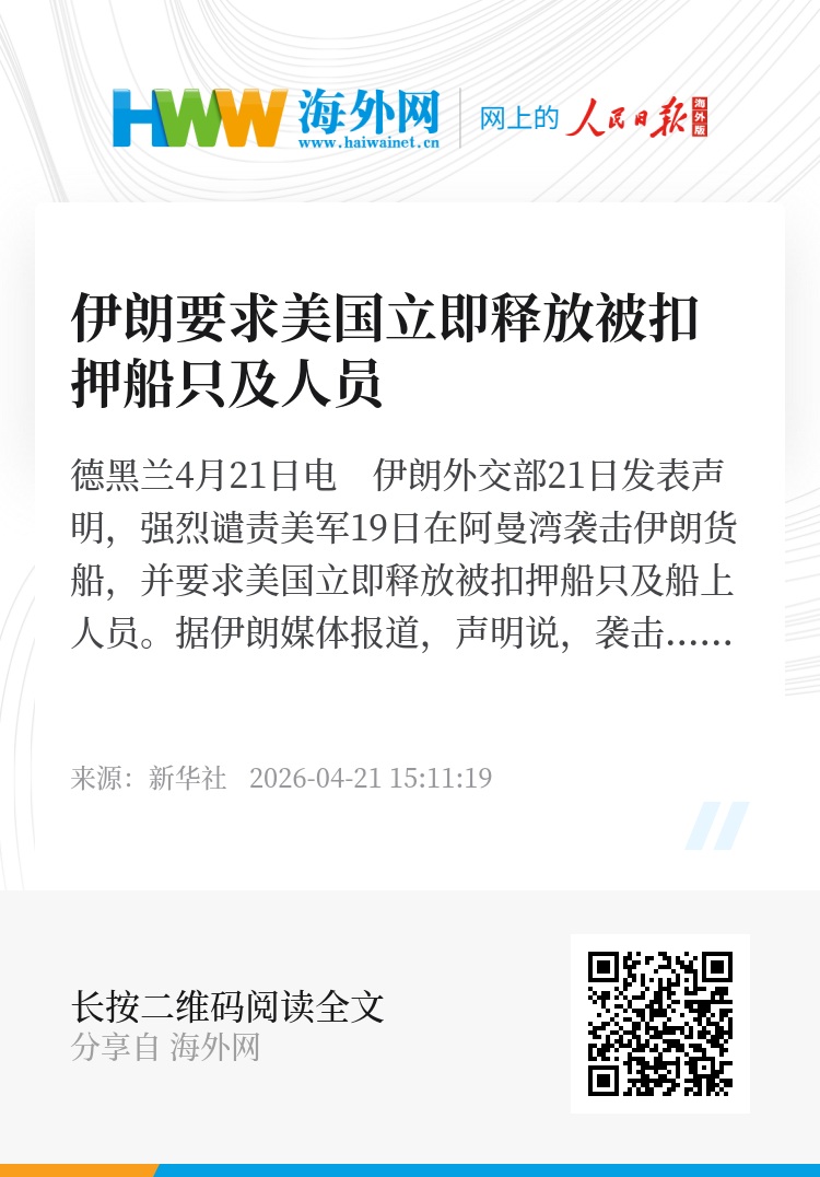 新华社德黑兰4月21日电 伊朗外交部21日发表声明,强烈谴责美军19日在阿曼湾袭击伊朗货船,并要求美国立即释放被扣押船只及船上人员。