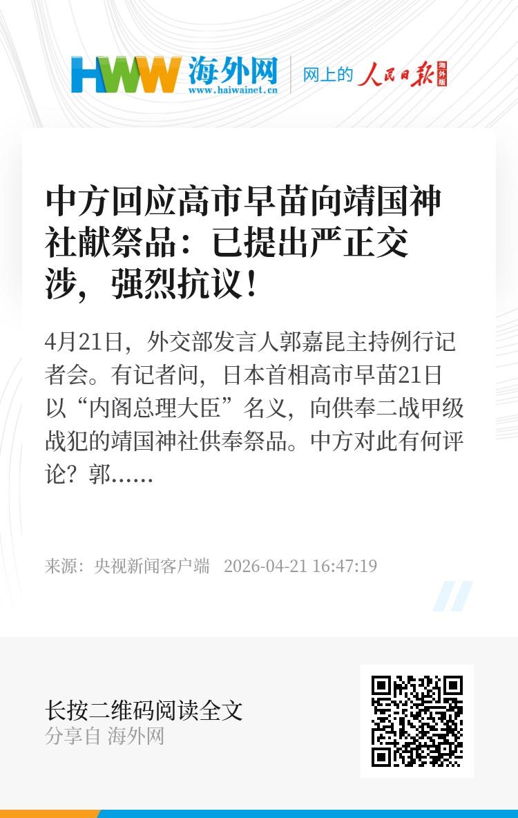 4月21日,外交部发言人郭嘉昆主持例行记者会。有记者问,日本首相高市早苗21日以“内阁总理大臣”名义,向供奉二战甲级战犯的靖国神社供奉祭品。中方对此有何评论?