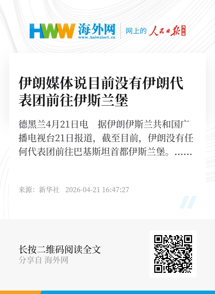 新华社德黑兰4月21日电 据伊朗伊斯兰共和国广播电视台21日报道,截至目前,伊朗没有任何代表团前往巴基斯坦首都伊斯兰堡。