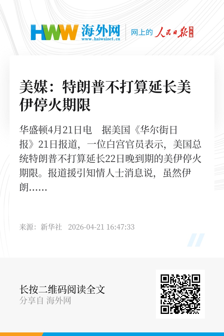 新华社华盛顿4月21日电 据美国《华尔街日报》21日报道,一位白宫官员表示,美国总统特朗普不打算延长22日晚到期的美伊停火期限。