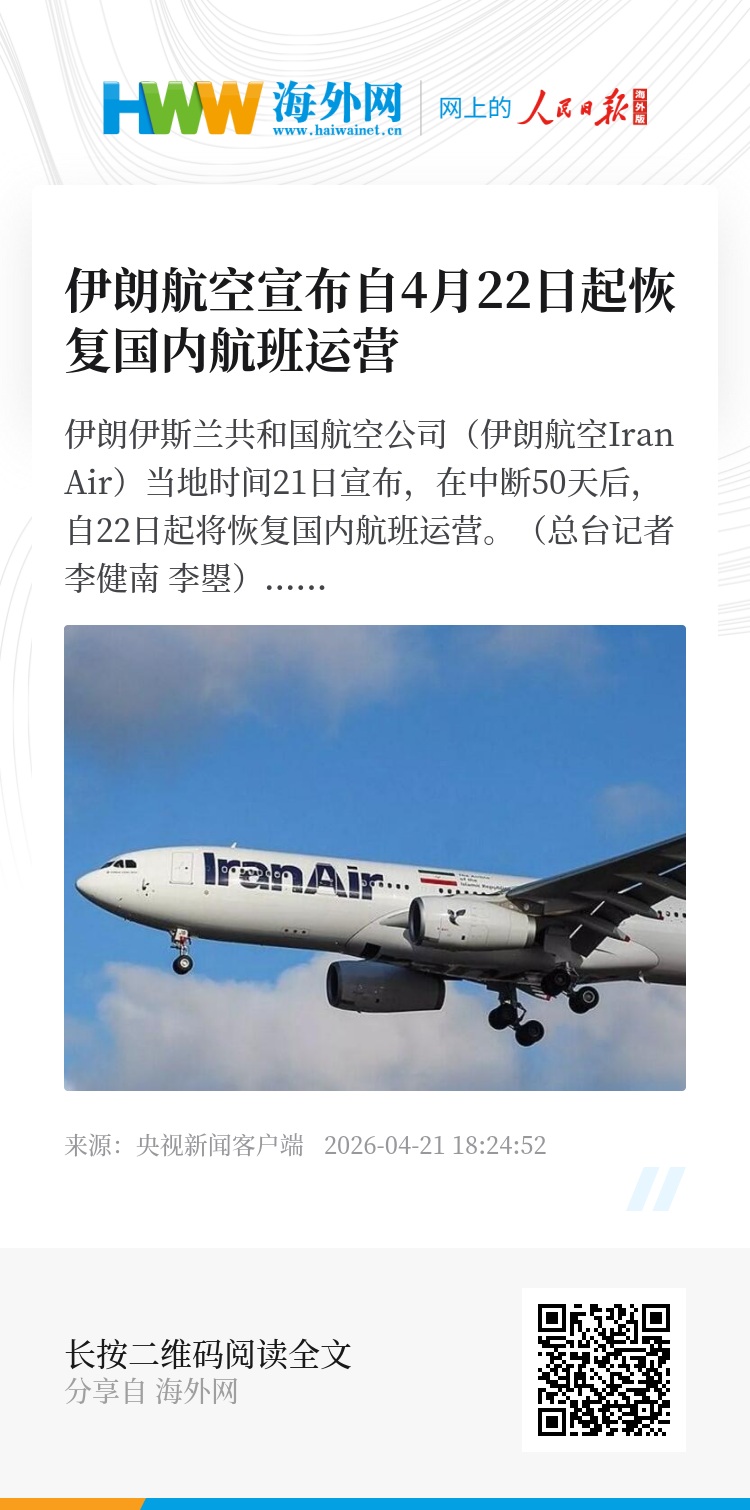 伊朗伊斯兰共和国航空公司(伊朗航空Iran Air)当地时间21日宣布,在中断50天后,自22日起将恢复国内航班运营。(总台记者 李健南 李曌)