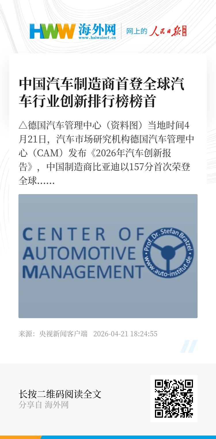 当地时间4月21日,汽车市场研究机构德国汽车管理中心(CAM)发布《2026年汽车创新报告》,中国制造商比亚迪以157分首次荣登全球汽车行业创新排行榜榜首,超越去年的冠军大众汽车(143分)。梅赛德斯-奔驰以134分位列第三。小鹏汽车(128分)、宝马和吉利集团紧随其后,位列第四至第六。雷诺、丰田、通用和现代汽车则位列前十。