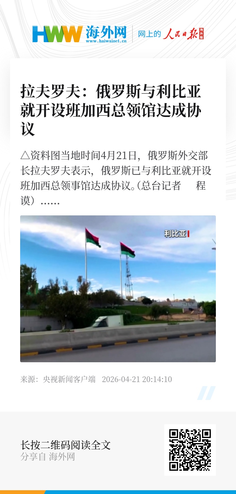 当地时间4月21日,俄罗斯外交部长拉夫罗夫表示,俄罗斯已与利比亚就开设班加西总领事馆达成协议。(总台记者 程谟)