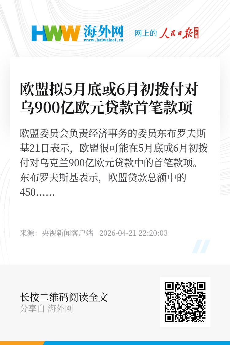 欧盟委员会负责经济事务的委员东布罗夫斯基21日表示,欧盟很可能在5月底或6月初拨付对乌克兰900亿欧元贷款中的首笔款项。
