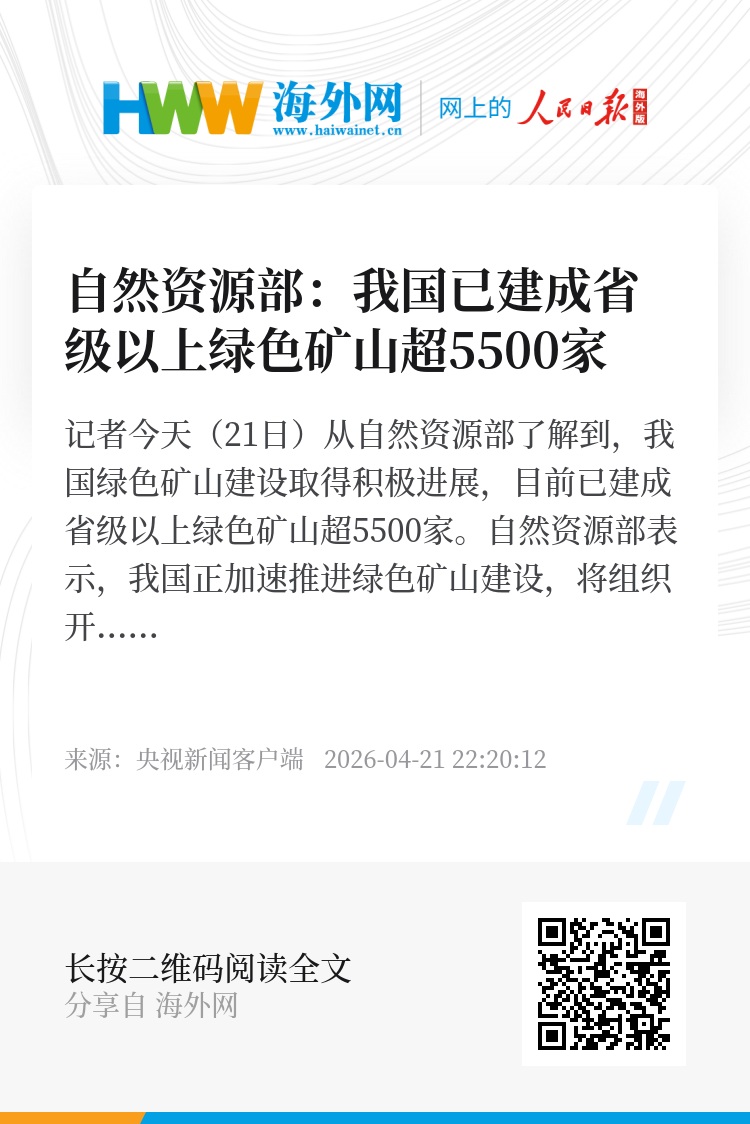 记者今天(21日)从自然资源部了解到,我国绿色矿山建设取得积极进展,目前已建成省级以上绿色矿山超5500家。