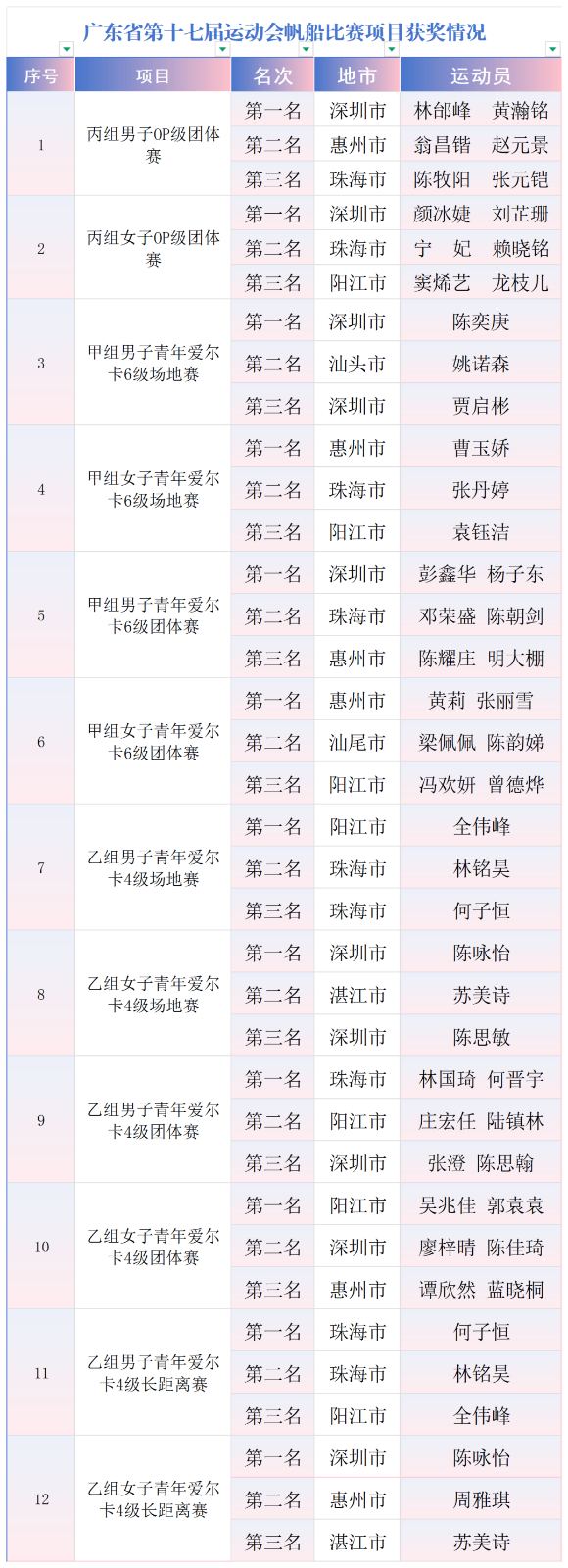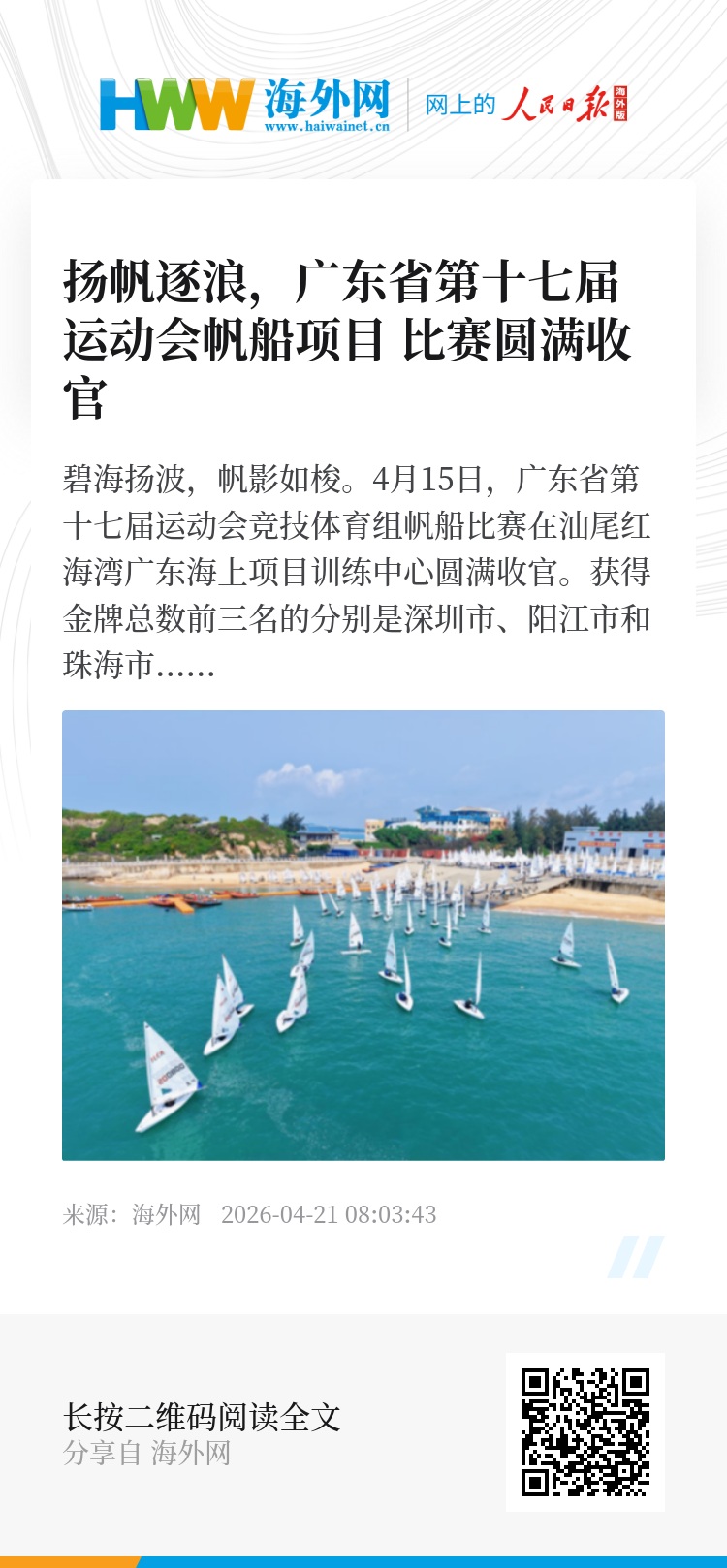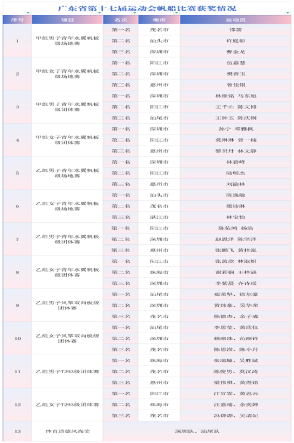 碧海扬波,帆影如梭。4月15日,广东省第十七届运动会竞技体育组帆船比赛在汕尾红海湾广东海上项目训练中心圆满收官。获得金牌总数前三名的分别是深圳市、阳江市和珠海市。深圳市和汕尾市获得运动队体育道德风尚奖。