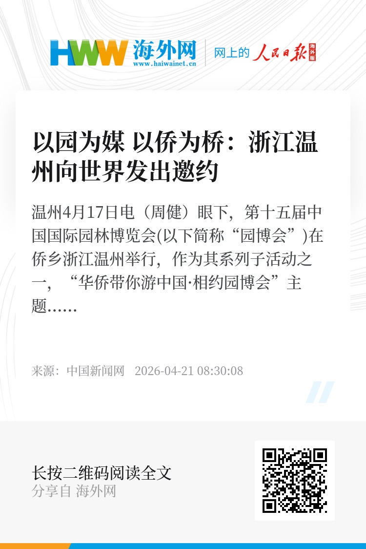 中新网温州4月17日电(周健)眼下,第十五届中国国际园林博览会(以下简称“园博会”)在侨乡浙江温州举行,作为其系列子活动之一,“华侨带你游中国·相约园博会”主题活动以园为媒、以侨为桥,邀请海内外温籍侨领、国际友人齐聚一堂,共赴园林之约、共话中外合作。