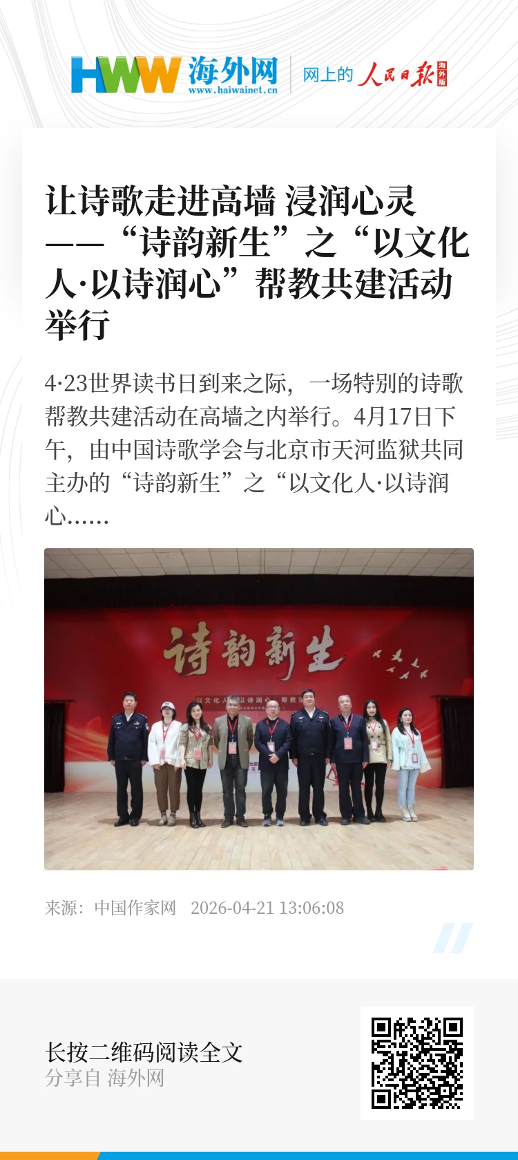 中国诗歌学会与天河监狱还在活动现场签署了“文化帮教协议”。据悉,此次走进天河监狱的阅读活动,系中国诗歌学会“与您一起读书”品牌首次在司法系统基层落地,旨在将优质文化资源引入高墙,用诗歌与阅读的力量温暖人心、健全人格、唤醒良知,践行“以文化人”的社会责任。(康春华)