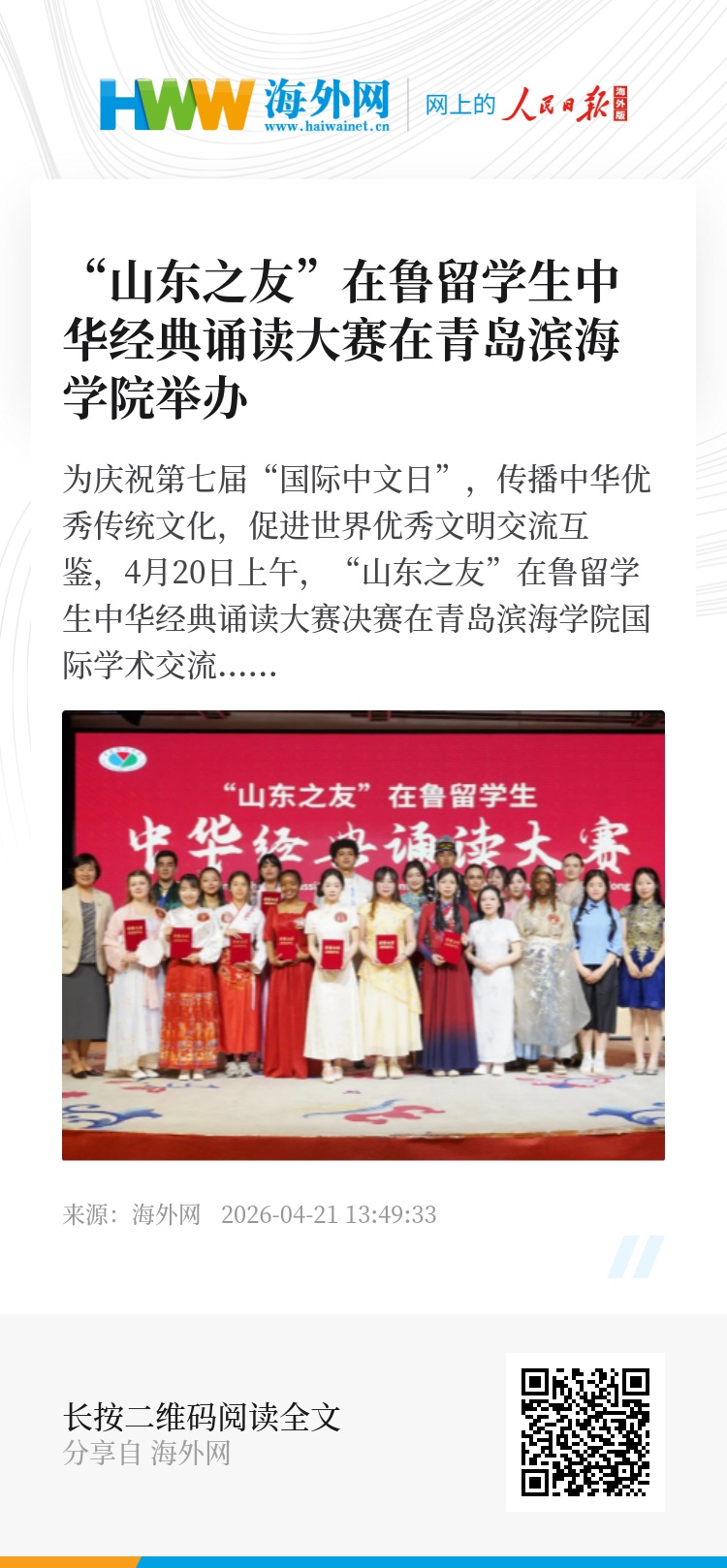 为庆祝第七届“国际中文日”,传播中华优秀传统文化,促进世界优秀文明交流互鉴,4月20日上午,“山东之友”在鲁留学生中华经典诵读大赛决赛在青岛滨海学院国际学术交流中心举行。