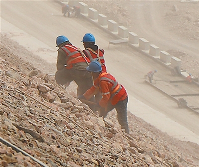 “溜槽就像‘滑梯’,混凝土从坝顶坐上‘滑梯’,‘滑’到特定高度,进入专属于它的位置,完成入仓。”新疆葛洲坝大石峡水利枢纽开发有限公司副总经理汤国忠介绍,高坝让“滑梯”的长度达到300多米,同类型工程中没有先例可借鉴。